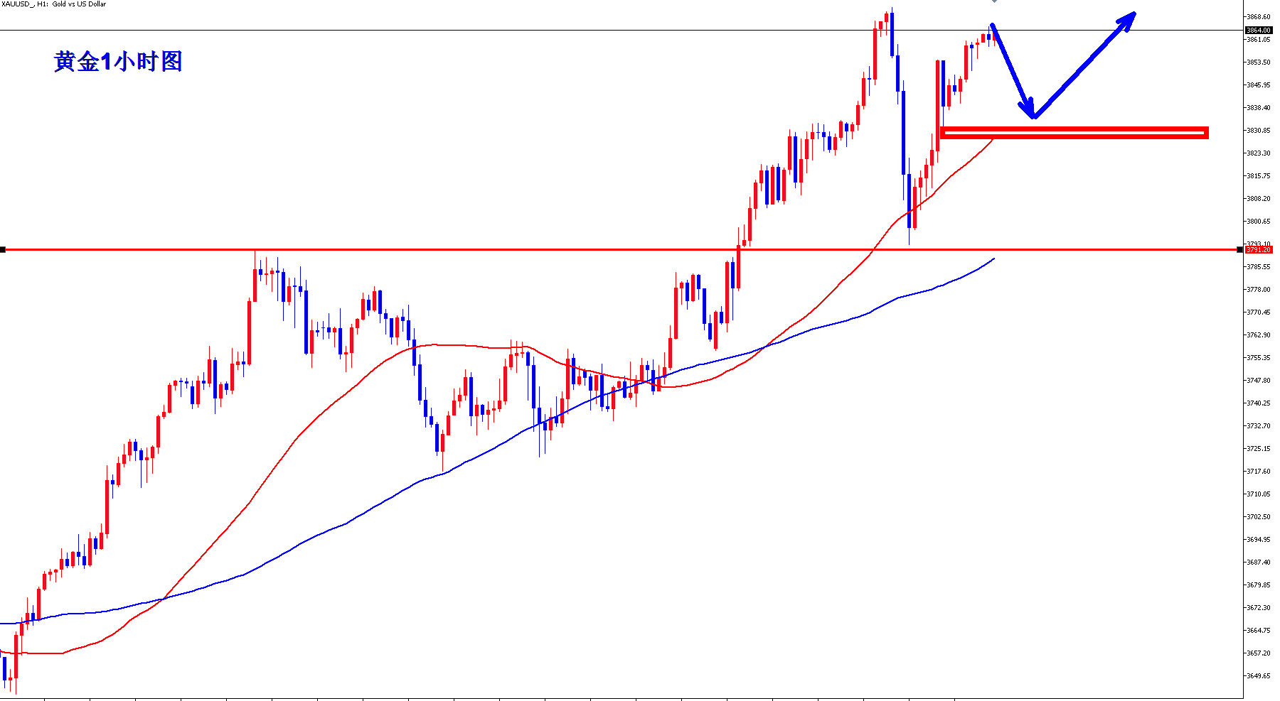 黄金昨天虽然下跌幅度很大,不过并未跌破3791的这个中期支撑位,黄金空头并没有完全占优势,后面震荡甚至多头的反攻也就在情理之中,黄金1小时均线还是金叉向上的多头排列,没有任何拐头迹象,那么黄金多头的量能就还是十分充足,黄金均线支撑现在已经上移到3828附近一线,回家早盘回落3828上继续逢低做多。
