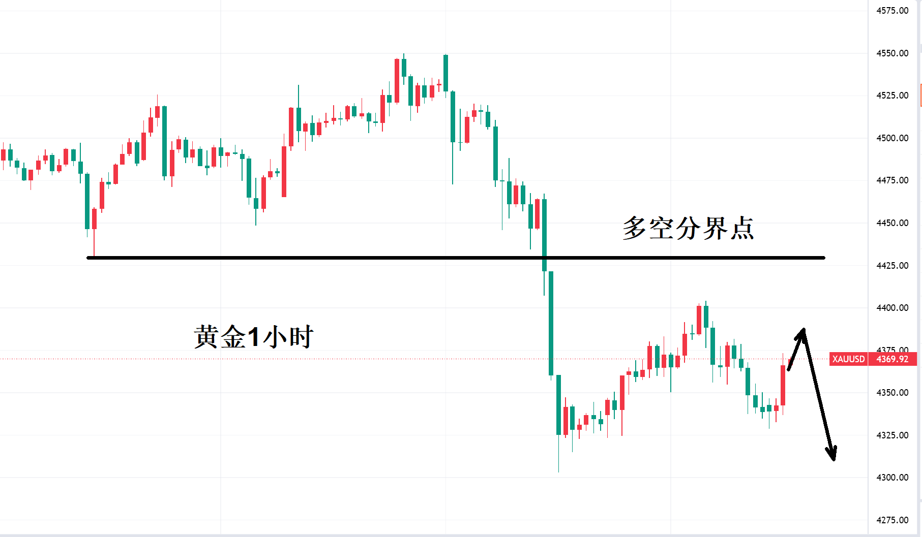 今天同样先反弹后回落,这一次下来后破位4300美元就可能向4250-4230美元迈进,上面压力还是集体在4400美元附近,极限在4420美元,震荡行情多空没有对错之分,只是各自位置决定盈亏。