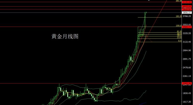 昨日黄金市场完成9月的最终构造,月初行情开盘在3449.3的位置后行情小幅回踩给出3435.5的位置后行情强势震荡拉升,月内连破多重整数关口后尾盘最高触及到了3872的历史新高后行情区间整理,月线最终收线在了3858.4的位置后,月线以一根略带影线的饱和大阳线收线,而这种月内涨幅超400美元的月线主要原因在于美联储在美国数据很差的背景下才开启新一轮的降息周期让市场的避险情绪提升以及中东和俄乌之间的冲突加剧的共同因素导致的趋势性强拉升形态,这种大阳线在技术上虽然具备连续拉升能力,但短期过快的拉升也导致技术背离形态,行情如果不调整直接拉升遇阻后很容易引起获利了结过程,所以主流趋势看多,遇强压力做短波段空单就是10月的主流思路。