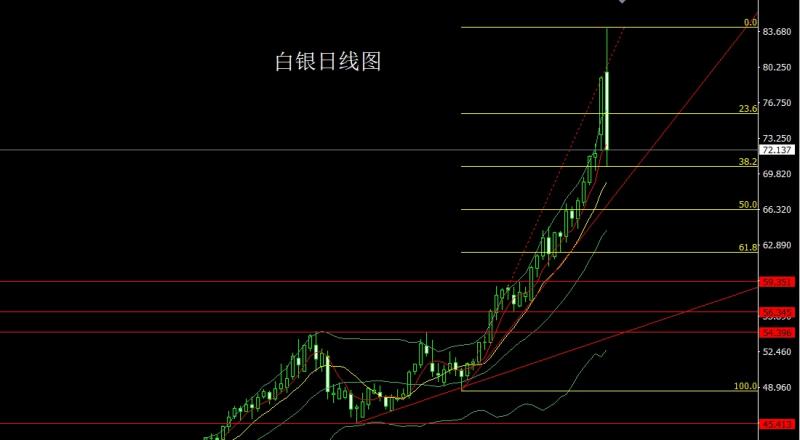 白银市场昨日早盘高开在79.679的位置后行情先拉升给出84.016的历史新高后行情获利了结强势回落,日线最低给到了70.493的位置后行情整理,日线最终收线在了72.137的位置后,日线以一根上影线极长的大阴线收线,而这样的形态收尾后下方37.8的多和38.8的50.75的多和52.7的多减仓后止损跟进在68,今日70.9多止损70.7,目标看71.5和71.8-72.