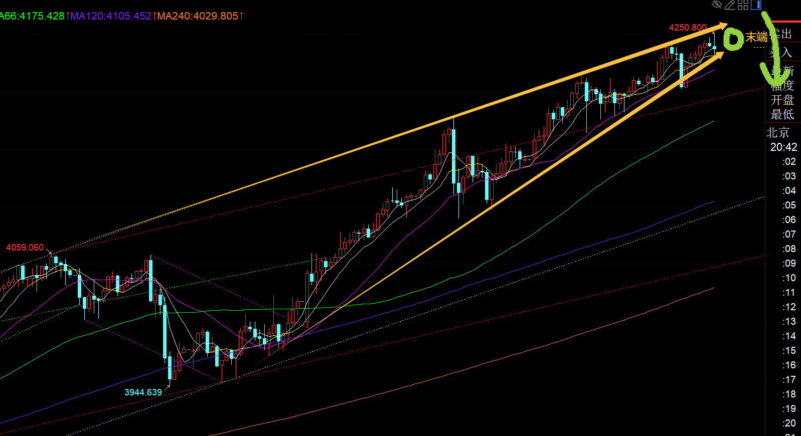 第二,黄金小时线级别:隔夜收盘于相对高位,今日早间仍是循环直接续涨,午后承压图中通道上轨4242下,急跌一波,这条趋势阻力线还是昨日欧盘承压4218的那条,然后14点收报饱满大阴,抵达4210目标;由于是大阴,并未是长下影K,所以反弹一波确认5均线4230-34压制后,可以再尝试看压制下行,但可惜只给到4222,欧盘连阳探底洗盘拉升,再刷了历史新高;不过,今晚得谨慎,一方面4255一线是通道反压点,另一个方面它走上升收敛三角末端,给它运行的空间不大了,随时会变盘; 因此,支撑还是中轨4220,只有有效跌破失守它,那么才会迎来短期稍大的调整概率,阻力是4255,其下逢高就尽量谨慎盲目追涨,看两个位置的得失情况,靠边等待信号;