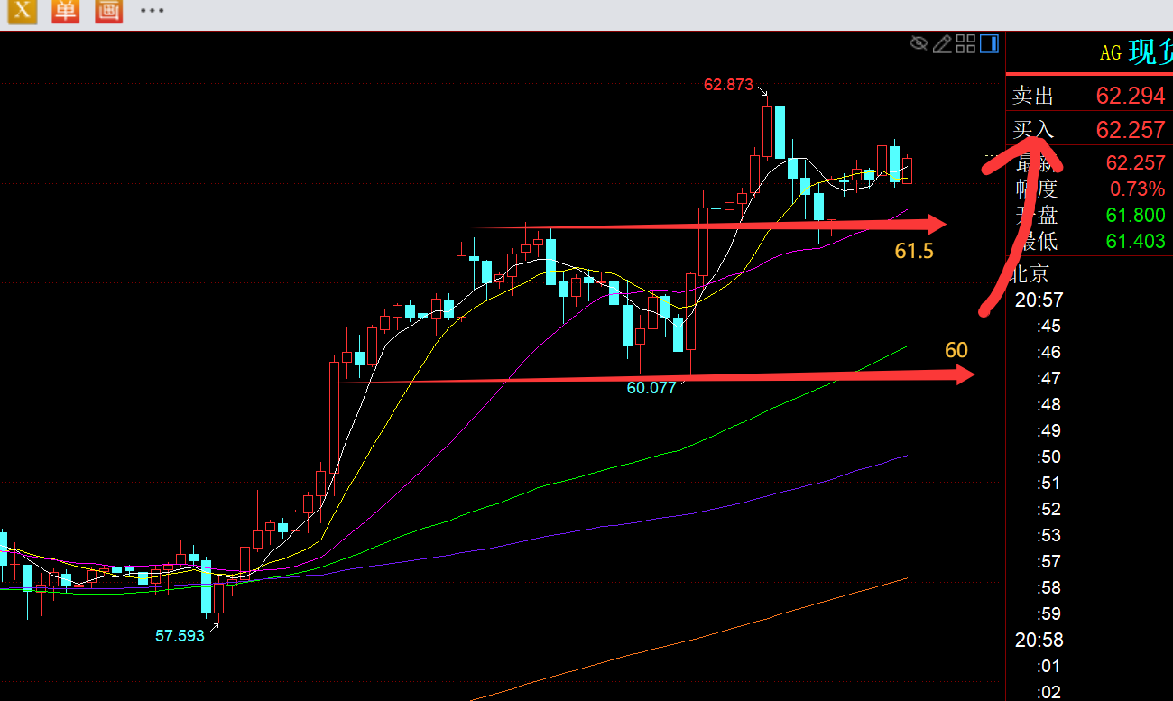 白银方面:日线继续连阳单边逼空走强延续,维持看涨为主,今晚仍留意61.5、60两支撑企稳,阻力63.4;