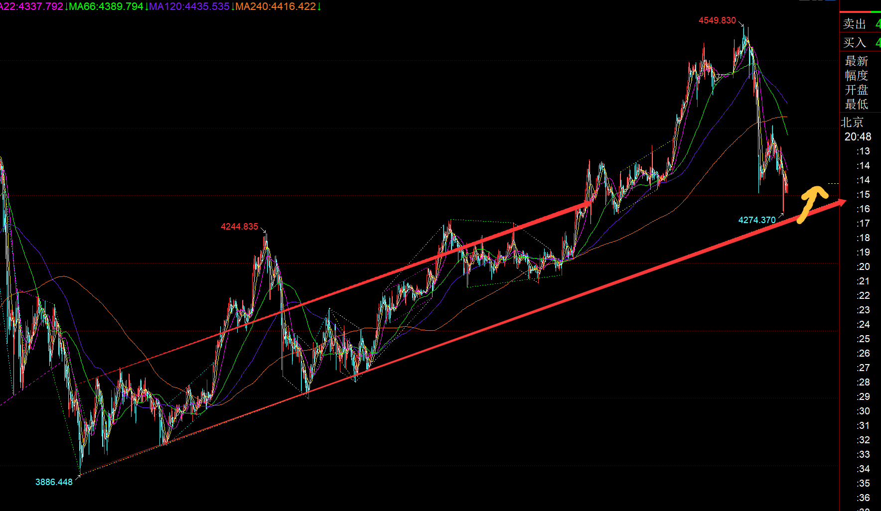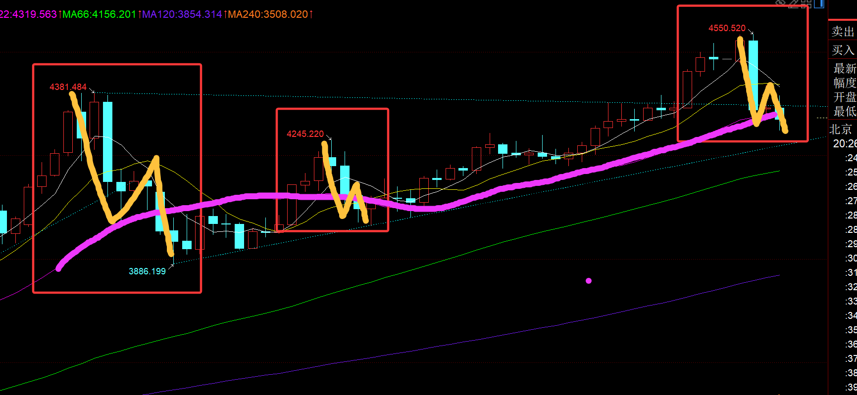 第一,黄金日线级别:下午针对上图做了一次调查,这周的一波下跌砸盘会循环走10月份中旬那波,还是11月中旬那波,基本上两者对半,选择概率都差不多;以我个人的判断来讲,结合图中所示,前期两波走势形态上都比较雷同,走完abc之后展开某一个底部区间整理,然后最终上破区间的上轨再单边发力上攻,而上轨其实指的是就是10均线;另外,紫色线代表中轨,两次都是击穿中轨才走完abc调整,无非就是c的力度有大小;而本周这次形态上如出一辙,也击穿了中轨,目前就是走最后c浪,也就是今晚或后续几日会产生一个底部区间,届时把握住此区间的相对低位,就是后市再次单边上攻的起涨点;因此,还是那句话,珍惜今年打压给出的低位;那么参考位置有哪些呢? 第一,是4275,这是昨日研报提及的50%分割支撑点,第二,4264-4251-4245都是前期顶底转换支撑点;第三,日线前期收敛三角下轨支撑点,今日对应下去是4227左右;第四,周线10均线,以及618分割支撑,对应4208-4205,属于强支撑;所以,个人认为,短期内的底部低点就在这四个支撑的其中一个;而判断正式成立出短期底部低点的形态就是哪天收阳于10均线之上,耐心等待,大牛市始终都在,2028前都很难改变;