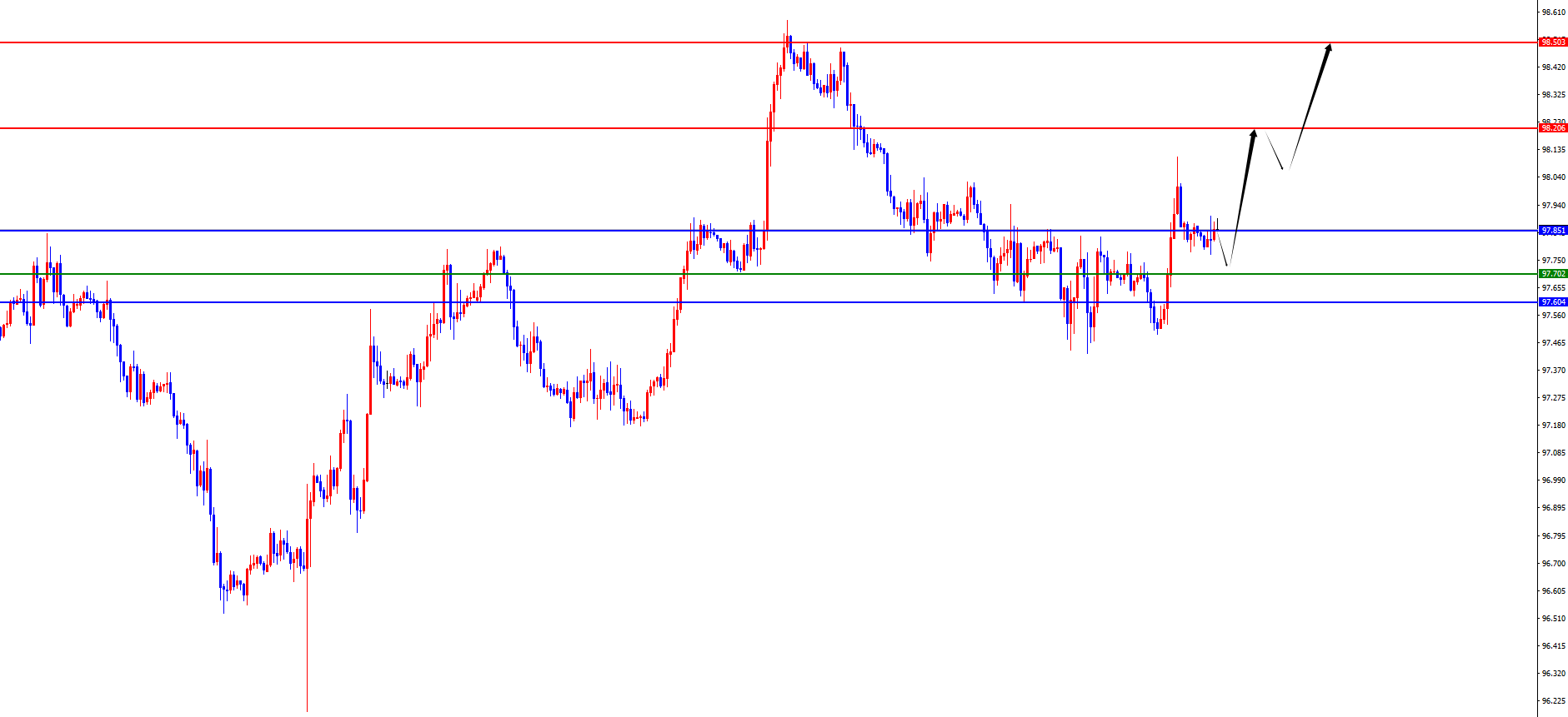 从多周期分析,周线级别来看近期价格在周线关键上下盘整,目前周线支撑于97.85区域,同时在上周价格站上周线阻力,后续看中期看多头延续。从日线级别看,随着时间的推移目前日线支撑于97.60区域,价格此位置之上波段进一步上涨。从四小时上看,昨日美盘向上突破四小时阻力位置,则前期阻力变支撑,目前重点关注97.70位置,价格在此位置之上短期多头对待。一小时上目前短线调整,待价格回踩至四小时支撑区域后继续关注上扬,上方关注98.20-98.50区域,一旦突破98.50则多头将持续延续。
