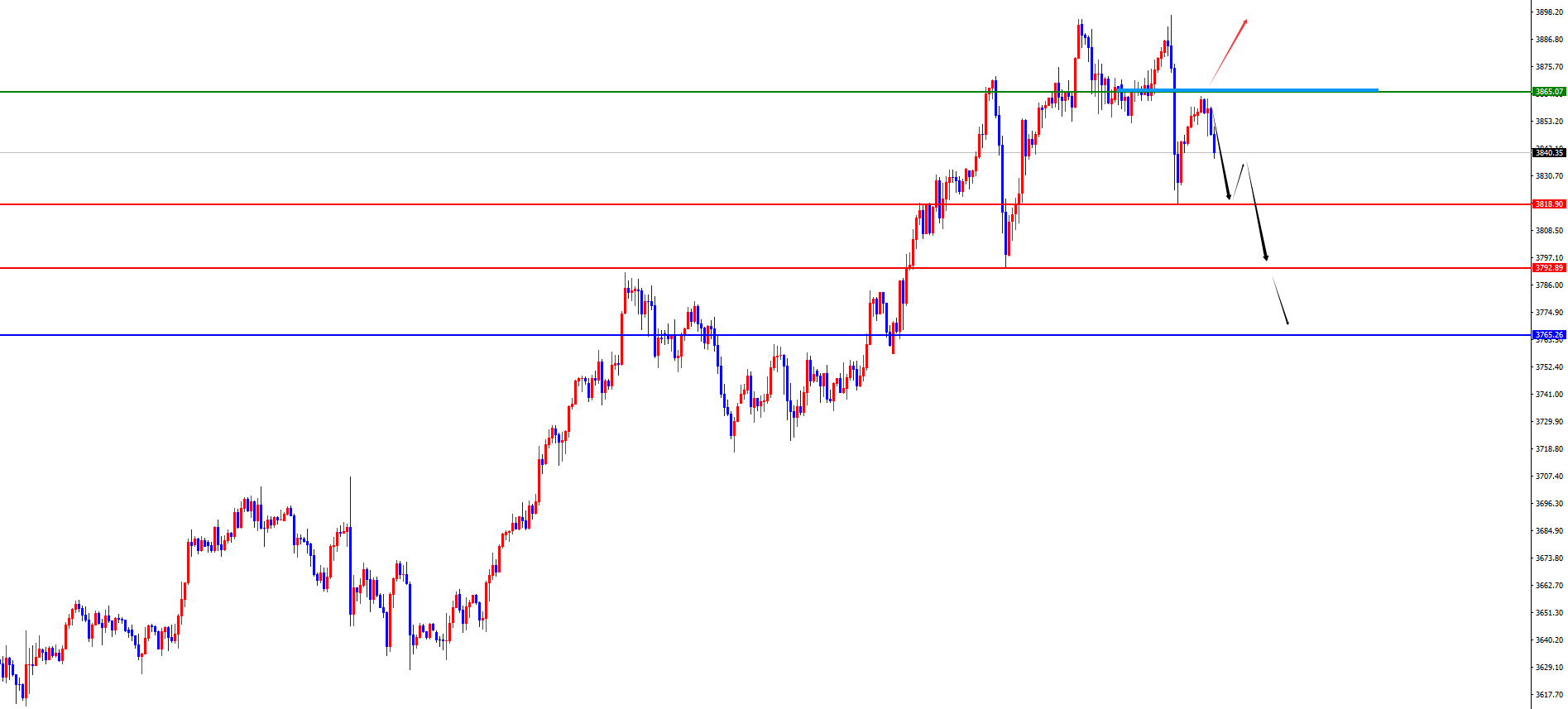 从多周期分析,首先观察月线节奏,从长线上看3130位置是长线走势的分水岭,价格在此位置之上长线多对待即可。从周线级别看,目前周线多空分水岭于3490位置,价格在此位置之上中线多对待即可。从日线级别看,暂时需要关注3765区域支撑,此位置之上波段多对待,目前继续右侧交易方式对待。从四小时上看,价格昨日正如笔者所言向下破位四小时支撑,目前随着时间的推移四小时阻力于3863-3865区间,此位置之下暂时先关注承压,同时昨日强调黄金近期两种节奏,所以暂时重点关注四小时阻力得失,操作上先右侧交易方式对待。
