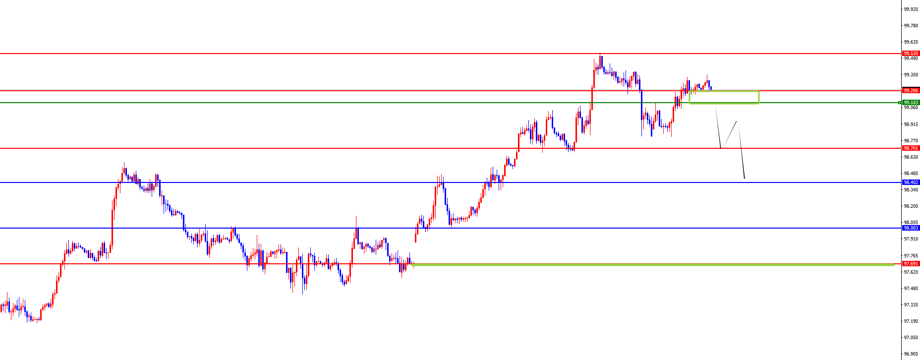 从多周期分析,周线价格经过前期持续震荡后于上周进行站稳,目前周线支撑于98区域,后续关注进一步中期多头。从日线级别看,随着时间的推移目前日线支撑于98.40区域,价格此位置之上波段进一步上涨。从四小时上看,在上周五价格跌破四小时支撑位置,则短线偏承压,同时我们需要注意上周跳空缺口位置,目前四小时阻力于99.10-20区间,价格短期在此位置上下盘整,后续持续关注此位置进一步跌破开启短期的调整动作。一小时上价格目前同样偏承压。所以综合看目前激进者依托上周高点下于今日早盘附近看承压,保守者可以等待跌破99.10后再跟随。