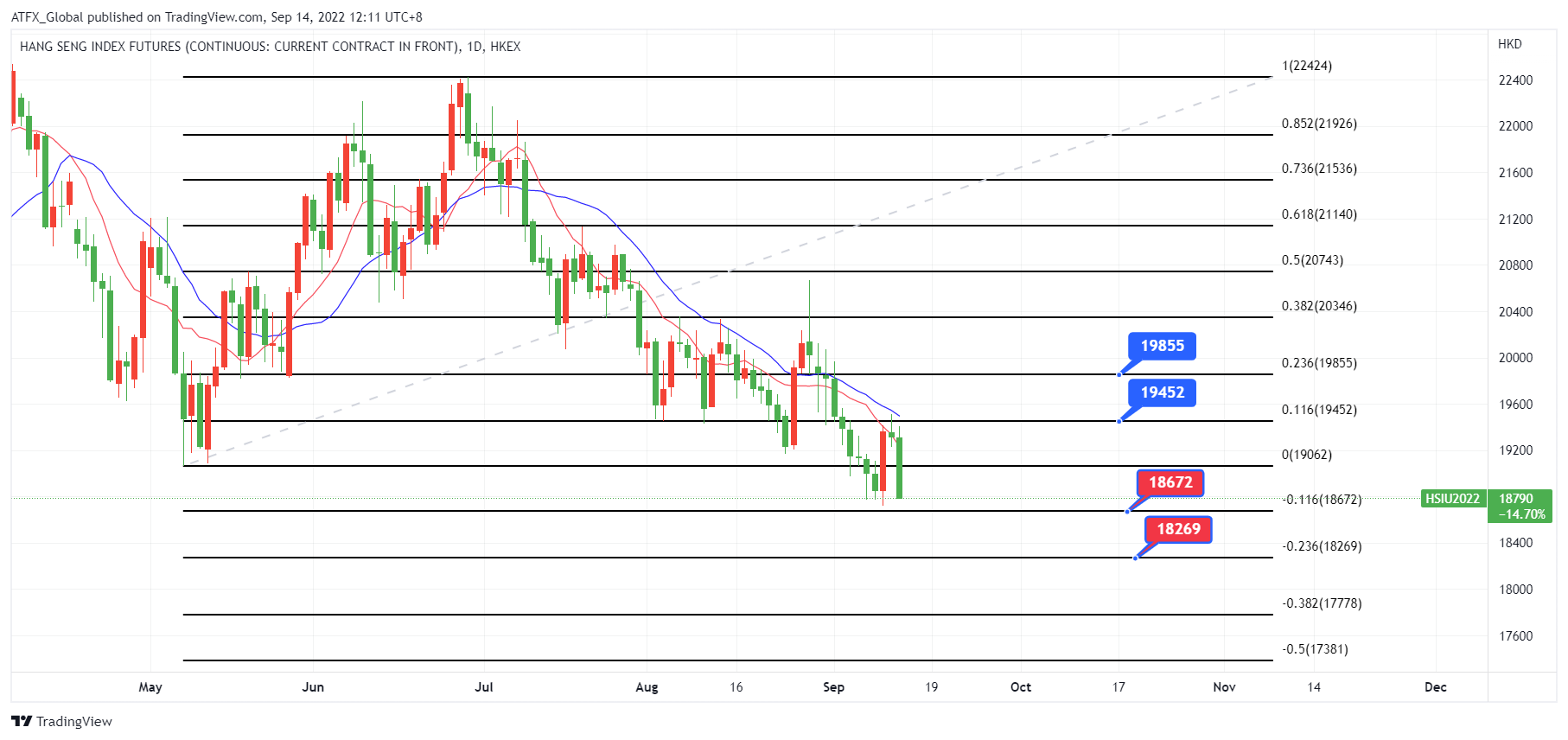 ATFX恒指:周二数美国重磅数据显示, 美国8月CPI同比上涨8.3%,高于市场预期的8.1%,尤其是8月核心CPI同比上涨6.3%,也高于市场预期的6.1%,这表明CPI仍然呈现居高不下的态势,巩固美联储美联储9月21日议息决意加息幅度至75个基点。 美国8月CPI数据结果令市场继续加剧对美联储大幅加息的押注,预计加息75个基点已经成为市场主导观点, 市场现在也开始定价美联储下周加息 1% 的可能性。市场在评估美国加息幅度75个基点的概率达至82%, 更有大型金融机构估算加息100基点, 概率是11%至16%。料美联储仅加息50个基点大幅缩减。维持强劲的美国通胀数据, 支持美联储未来可能会持续鹰派立场,加息幅度将可能再大幅度上调, 这对于股票投资者是一个负面的信号,更令隔晚美国股市大幅下挫。道琼斯指数收盘跌1276.33点, 跌幅3.94%, 标普500指数再次收报4000点以下, 跌177.72, 跌幅4.32%。对利率变化较敏感的新经济及科技股为主的纳斯达克指数全面下挫, 并再次跌进11000点水平, 收盘跌5.16%。相比美国三大指数跌幅, 香港恒生指数开盘仅跌2.6%附近, 但走势上恒生指数仍徘徊于1个月低位。