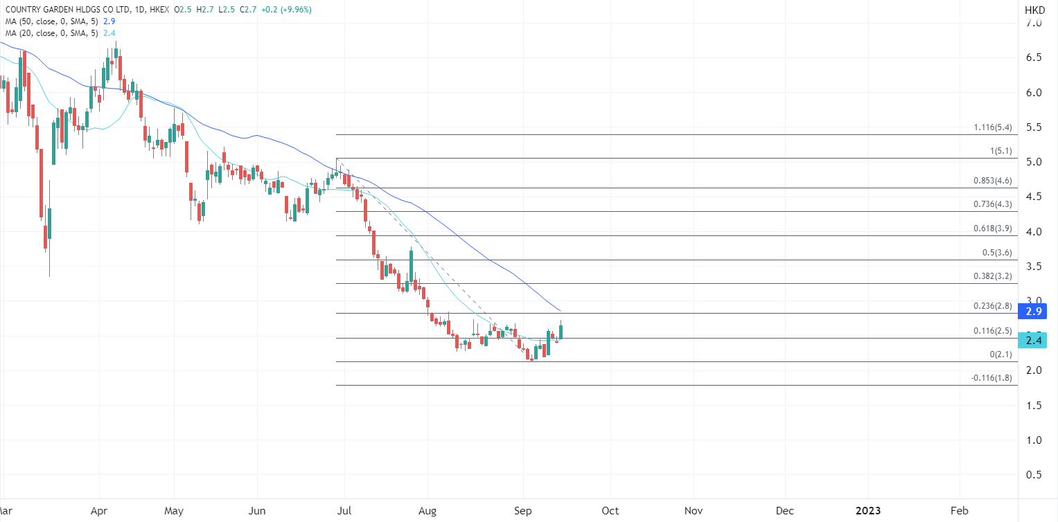 当前适逢金九银十,虽然传统行情已经不再明显,不过近期的销售数据显示8月新房销售同比降幅小幅收窄,这种趋势有望在年底前保持,尤其是在双节期间的销售数据值得期待。日内急涨的碧桂园在8月份实现归属于本公司股东权益的合同销售金额环比下降4.11%,同比下降36.12%,降幅见收窄,预计未来两个月数据可继续回升。当前股价尝试刷一个月高位,如果突破2.8元可带来更多技术性改善。