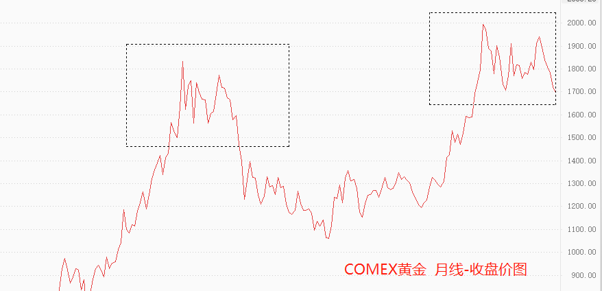 2011年8月,COMEX黄金创出历史新高1917美元,随后开始震荡下行,至2012年5月跌至1526美元后获得支撑再度上涨。2012年9月份达到次高点1790美元,之后启动长达三年的下跌走势。创新高-回调-反弹至次高点-长周期下跌,该模式在技术分析领域被称为双顶/回踩确认,是顶部形成的典型特征。