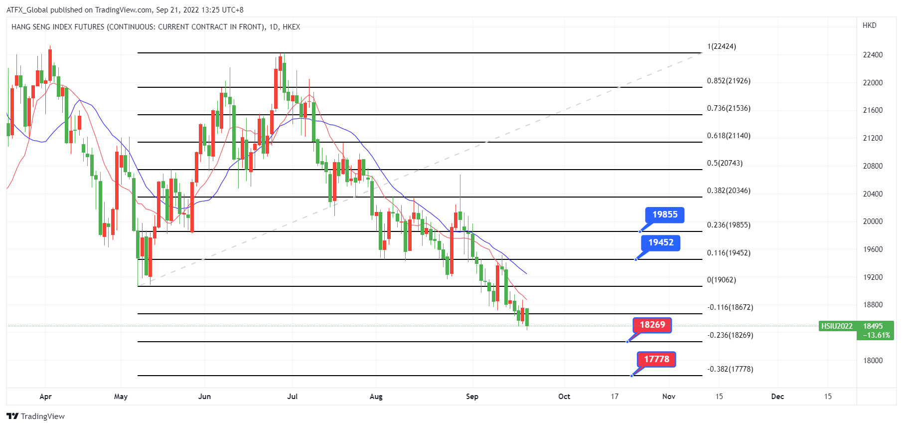 ATFX恒指:美元升至近 20 年高位,而美国国债收益率也因预期加息而飙升。亚洲股市周三下跌,追随华尔街隔夜跌幅,恒生指数挫开盘低开再挫三百点, 连续四个交易下跌, 因投资者等待周四早上美联储加息幅度结果和可能继续发出更多鹰派信号。受利息上调的忧虑以至经济可能衰退影响, 香港以科技股为主的恒生指数继续落后于同业,平均下跌 2.5%。恒生指数成份内的金融业股亦平均跌逾一1%。受中国国内疫情封控, 恒生指数内的大部分中资股表现更较其他类股份逊息。