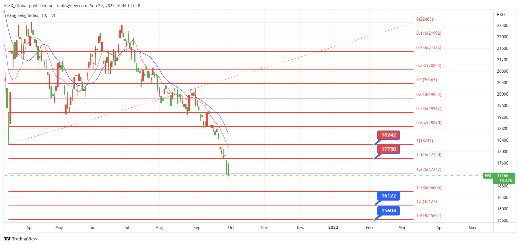 ATFX恒指:过往国庆假期普天同庆, 港股受中国经济支持成交畅旺, 就算去年疫情影响下投资者情绪仍非常乐观, 股市调整过后仍见曙光。可惜今年自二季开始, 外围及中国经济影响巨大, 中港以至亚洲股市走势持续下行, 直至今年的国庆临近, 香港股市仍然未见起色。