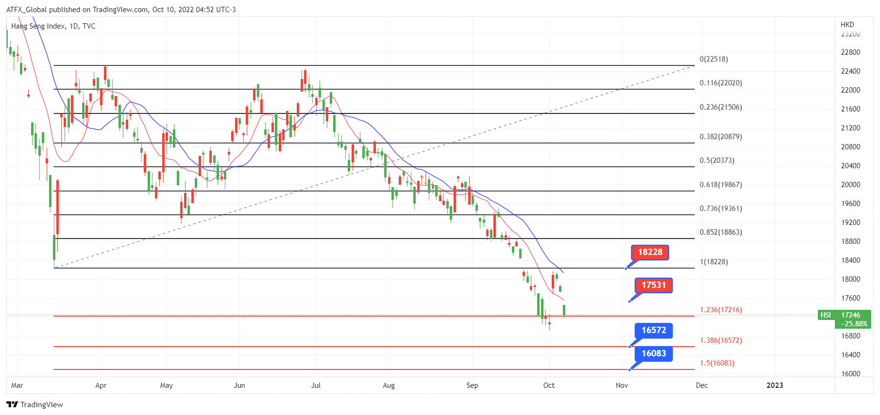 ATFX恒指:亚洲股市周一大幅下挫,中国芯片制造商因美国新的贸易限制而领跌,而市场普遍担心美联储将采取更鹰派措施。蓝筹沪深沪深 300 指数下跌 0.9%,而上证综指下跌 0.4%。港股也受到冲击,恒生指数下跌近 3%。 科技巨头阿里巴巴集团控股有限公司 (HK:9988)、百度 (HK:9888) 和腾讯控股有限公司 (HK:0700) 下跌 2% 至 4%。