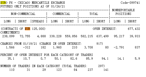 多头持仓和空头持仓的差值,即为持仓净值。持仓净值曲线的变动(前一期持仓净值减去后一期持仓净值),代表了外汇期货市场里的大型投资机构对交易标的未来趋势方向的判断。比如上图中所显示的,1月26日EUR非商业持仓的多头头寸238099,相比1月19日的多头头寸增加了1566;空头持仓为72755,相比1月19日的空头头寸减少了312 。那么,1月26日的多空净头寸和1月19日的多空净头寸的差值就是:1566+312=1878。也就是说,过去的一周,EUR的净多头持仓增长了1878手单子。这意味着市场上看多欧元未来走势的大型投资机构占多数,未来EUR的主要趋势为多头。有了这样一个判断,个人交易者就可以更加理性的看待当前的EURUSD技术走势。