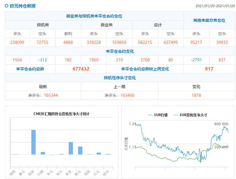 很明显,CFTC网站上的COT报告虽然是数据源,但排版晦涩难懂,很容易劝退大部英文不太好的交易者。中国也有很多外汇网站对CFTC的持仓报告进行简化解读,比如上图所示某通网的CFTC持仓报告的处理。我们只需要关注右下角的EUR投机性净头寸的曲线走势,就可以对当前(一周前)的市场情绪做出直观判断。
