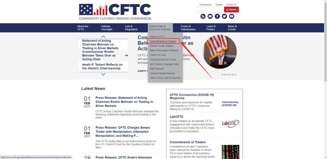 CFTC原始的数据报告叫做COT,全称Commitments of Traders ,直译的话叫做交易者承诺。COT可以在CFTC的官网上查询到,具体位置如下图: