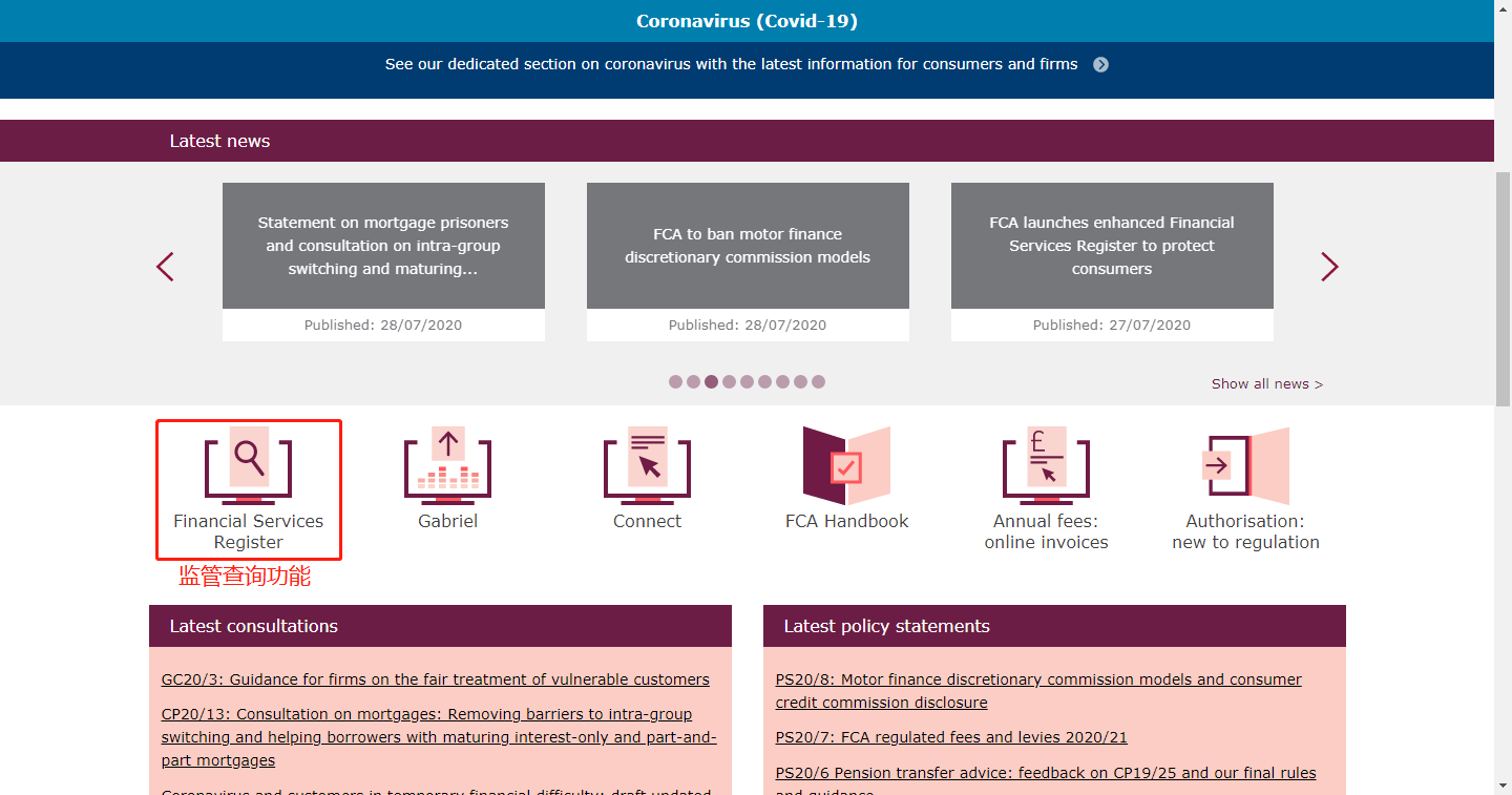 1、首先在地址栏输入FCA官方网址:www.fca.org.uk,之后按下回车键。由于FCA为外网,中国区网络打开时会有延迟、卡顿等,耐心等待即可。本次FCA界面更新,主要是针对监管查询功能页面的改动,首页并没有出现多大变化(如下图),尤其是代表性的六个功能图标,与改版前样式保持一致。