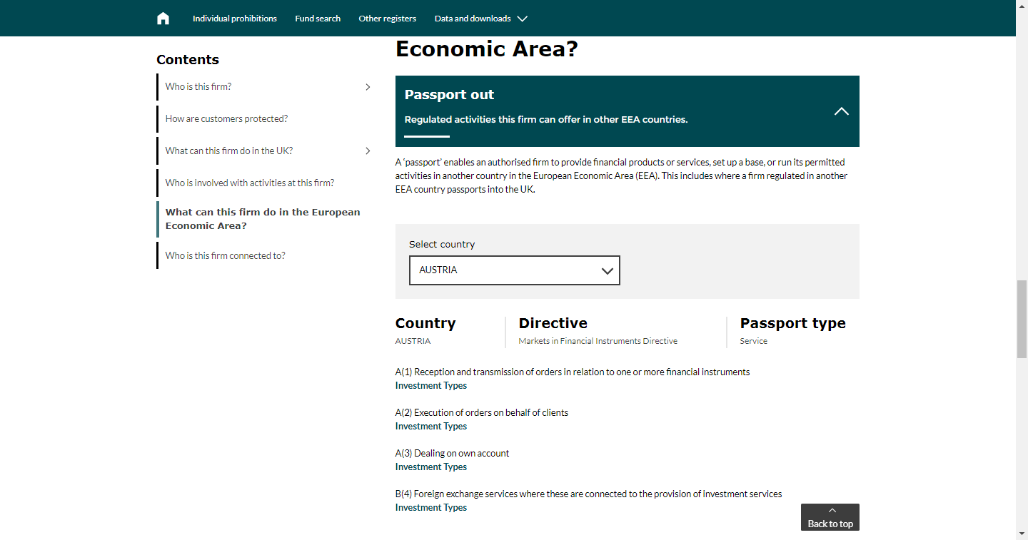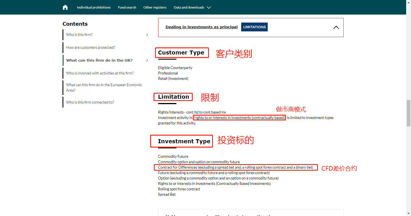 这一栏目在旧版当中名称为“permission”,新版虽然还了名称,但内容基本相同。比如:“ Dealing in investments as principal”(委托交易)栏目,可以看到客户类别、限制、和投资标的信息。其中“rights to or interests in investments (contractually based)”也就是通常意义上的做市商模式;“Contract for Differences”即为CFD合约的英文全称。