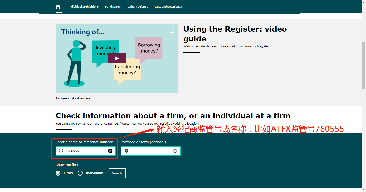 监管查询的搜索框变动较大,可以说和旧版的完全不同。旧版监管查询界面的主体就是一个搜索框,名称为“Search the Financial Services Register”,翻译为“搜索注册的金融服务”。这句话其实比较难理解,也存在一定程度的歧义。改版后的页面变得更加亲民和接地气,比如同样的搜索框,新的名称为:“Check information about a firm, or an individual at a firm”,翻译为“查验企业或者个人的相关信息”,这就要比旧版的名称容易理解的多。除了这一核心功能外,该页面还有其余的辅助功能,比如“How to use the Register(如何使用注册页面)”、“Using the Register: video guide(视频版教程)”、“Find financial services in your area(搜索你身边的金融服务)”等等。