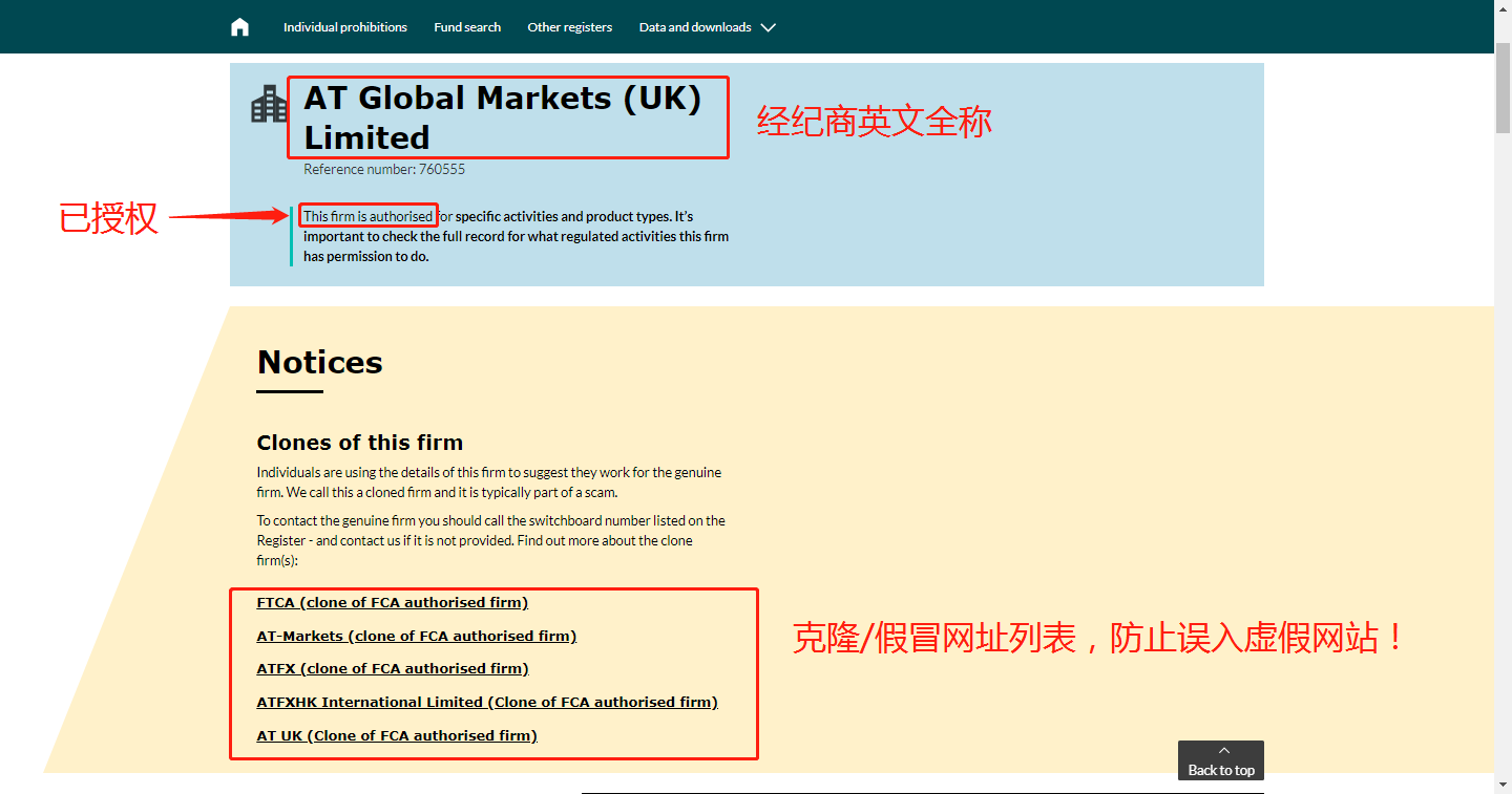 点开搜索结果当中的经纪商名称后,会进入该经纪商的详细页面。FCA将克隆/假冒网站做了详细列表,并且在页面的最顶部做展示,这是为了防止虚假公司恶意使用正规经纪商名称和监管号招摇撞骗,同时提醒投资者认准正规经纪商官方网址,切勿大意。