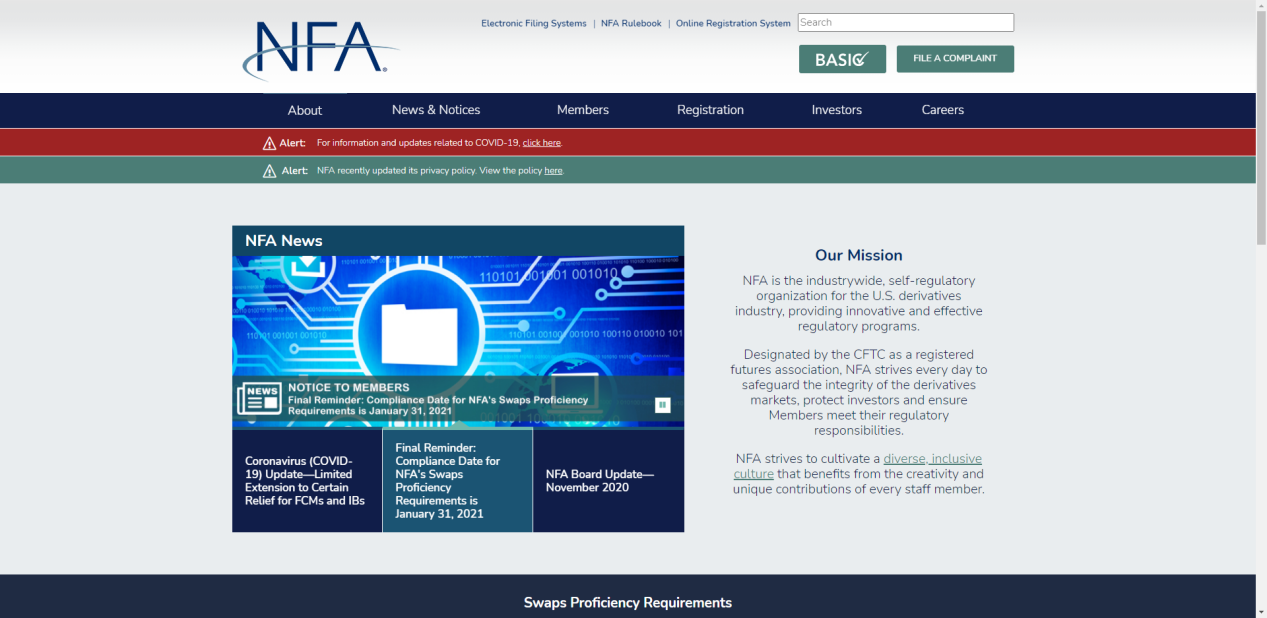 美国期货协会(NFA)是美国衍生品行业的自律组织(缩写为SRO),包括场内交易期货、场外零售外汇(forex)和场外衍生品(掉期)。NFA的资金来自会费和评估费,对许多市场参与者来说,会员资格是强制性的。NFA于1982年开始运作。美国国会在2000年和2008年通过立法,要求作为零售外汇做市商、外汇经纪商、交易顾问在CFTC注册,并成为NFA的成员。