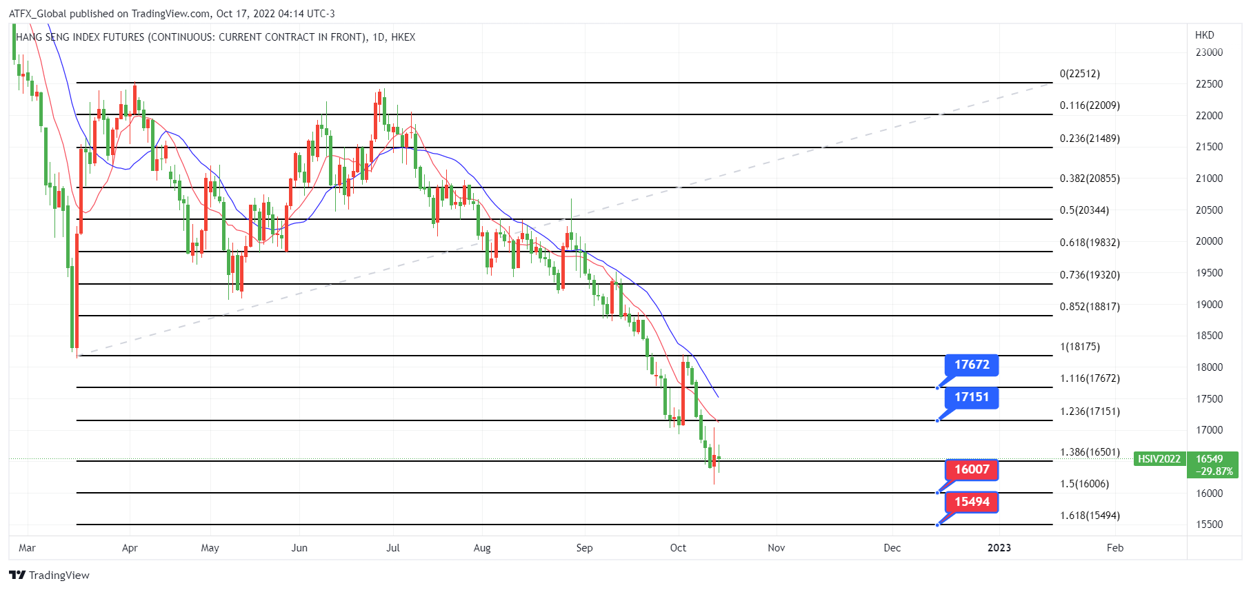 恒生指数期货自18,174拐点转弱, 上周五恒生指数期货曾迫近16,151点。技术上恒生指数期货仍继续沿10和20日均线轨道下方, 在中国第20次全国代表大会结束前, 估计市场需要肯定国家所宣布的政策会为经济带来一系列有效提振措施方可为中港两地股市提振, 收复近期的一部分跌幅。暂时技术走势必须留意10或20日线阻力, 即短期重要阻力位于该线17151及17672位置。若恒生指数突破最后防线的20日线并且站稳线之上, 恒生指数的后向将可望确认转强。否则, 技术上恒生指数在机会继续寻低, 向16000及15494点进发。