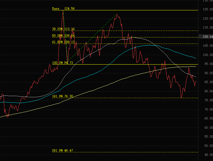 3、走势结构上看,3月8日和6月8日的两个高点依次降低,形成波浪理论的浪1和浪2结构。根据波浪理论比例规则,第一阻力位76.68已经在9月26日触及,下一阻力位是46.85美元,需要等到浪4调整结束并开启浪5才能触及,时间较长。