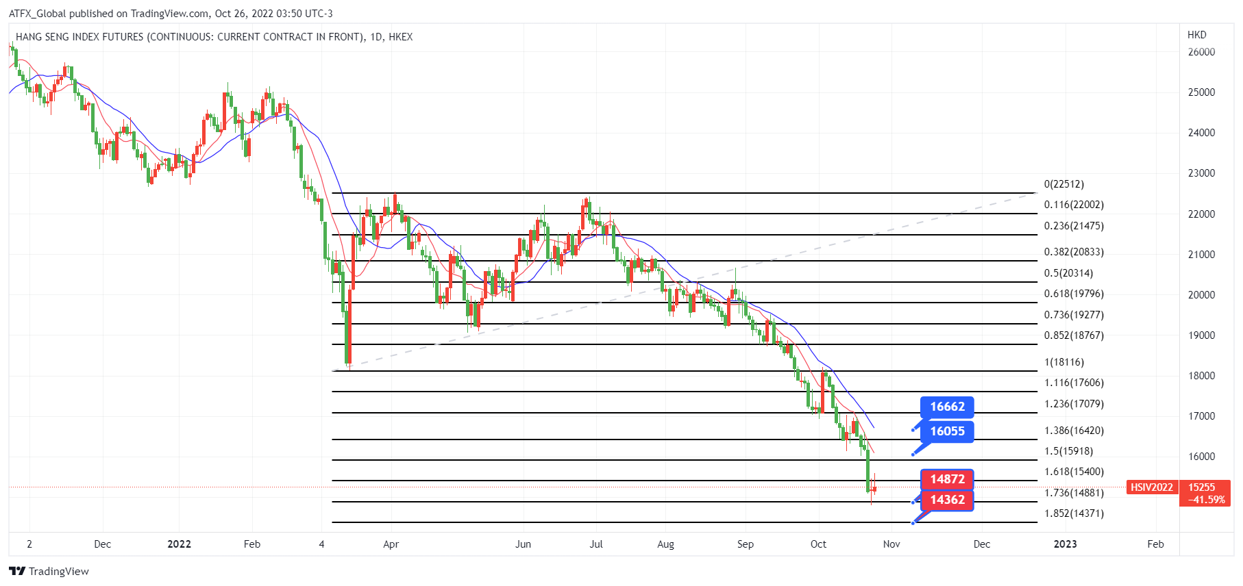 恒生指数期货自9月沿10日均线轨道下行延续至今, 若往后日子恒生指数期货上升将向16,055或14,662发展。相反, 若恒生指数突破该阻力防线将可望到达20日线17,079。否则, 技术上恒生指数在机会继续寻低先试前低14,872后再向裴波下跌浪的185.2%, 即14,362试探。