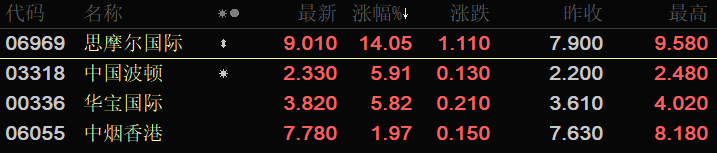 港股市场的烟草概念板块,关联个股有四只,总市值仅765.5亿元,并非权重板块。截至今日14:55,板块涨幅9.83 %,远超大盘的0.85%,对市场情绪提振作用显著,但对于恒生指数的上涨贡献并不大。领涨个股为思摩尔国际,涨幅14.05%,最新报价9.01港元/股。该企业专注于电子雾化产品的研发和制造,业内较为知名。版块内其它个股,诸如中国波顿(提取香精香料)、中烟香港(中烟集团子公司)、华宝国际(提取香精香料)等,均实现不同程度涨幅。