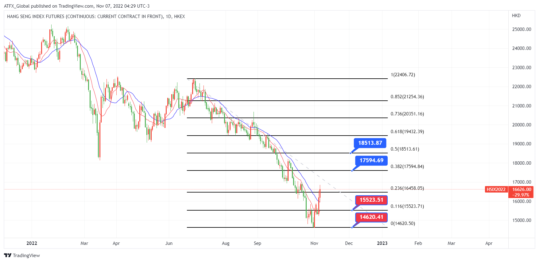 ATFX恒指:美国10月劳工市场放缓, 该时期的失业率由原估计上升0.1%至3.6%, 结果大过预期的情况下升至3.7%。而美国新增职位增长虽胜预期但较上月增幅收窄, 而且在部份大型企业所公布的削减增位数字显示, 它们预算在明年首季将会停止招人或可能减少部份职位, 主要是他们预期明年经济将受高企的通胀及持续涨息影响。由于投资人对美联储将放慢加息步伐的预期日益增强,大多数亚洲股市周一上涨。 相比之下,在中国重申其对维持严格的防疫相关的限制措施的承诺后,中国股市表现落后。恒生指数在上周结束时录得 8.73% 的惊人涨幅,中国以科技股为主的沪深 300 指数上涨超过 6%。 对美联储将在未来几个月以较慢的速度加息的预期日益增强,支持了恒生指数内等科技股。