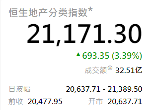 本周早些时候冲高回落的内房股在日内几乎集体急升,地产分类指数大幅飙升近700点,涨幅达到逾3%。早段碧桂园(2007.HK)曾急升26.4%报1.82元,最新仍升近两成四;碧桂园服务(6098.HK)升一成三;龙湖(0960.HK)升逾20%;旭辉(0884.HK)劲升四成三。