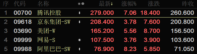大市值个股中,腾讯控股涨幅7.06%,市价逼近300港元;阿里巴巴涨幅8.23%,市价逼近100港元。其余大市值个股的涨幅介于3%至6%之间。腾讯控股曾是港股市场第一高价股,受行业景气度降低的影响,现如今却只能排在第三位。阿里巴巴是网购领域的绝对龙头,它的股价涨跌代表着一众上市公司的股价走向,比如京东集团、唯品会、拼多多等。在互联网+板块热度不断提高的情况下,上述两支个股最值得长期关注。