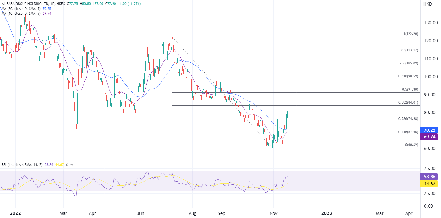 ATFX港股:阿里巴巴(9988.HK)股价昨日大涨逾11%后今早继续向好,早段重上80港元,阿里巴巴将于周四(17日)放榜,市场多数看好其盈利连跌四季后,有望恢复正增长。