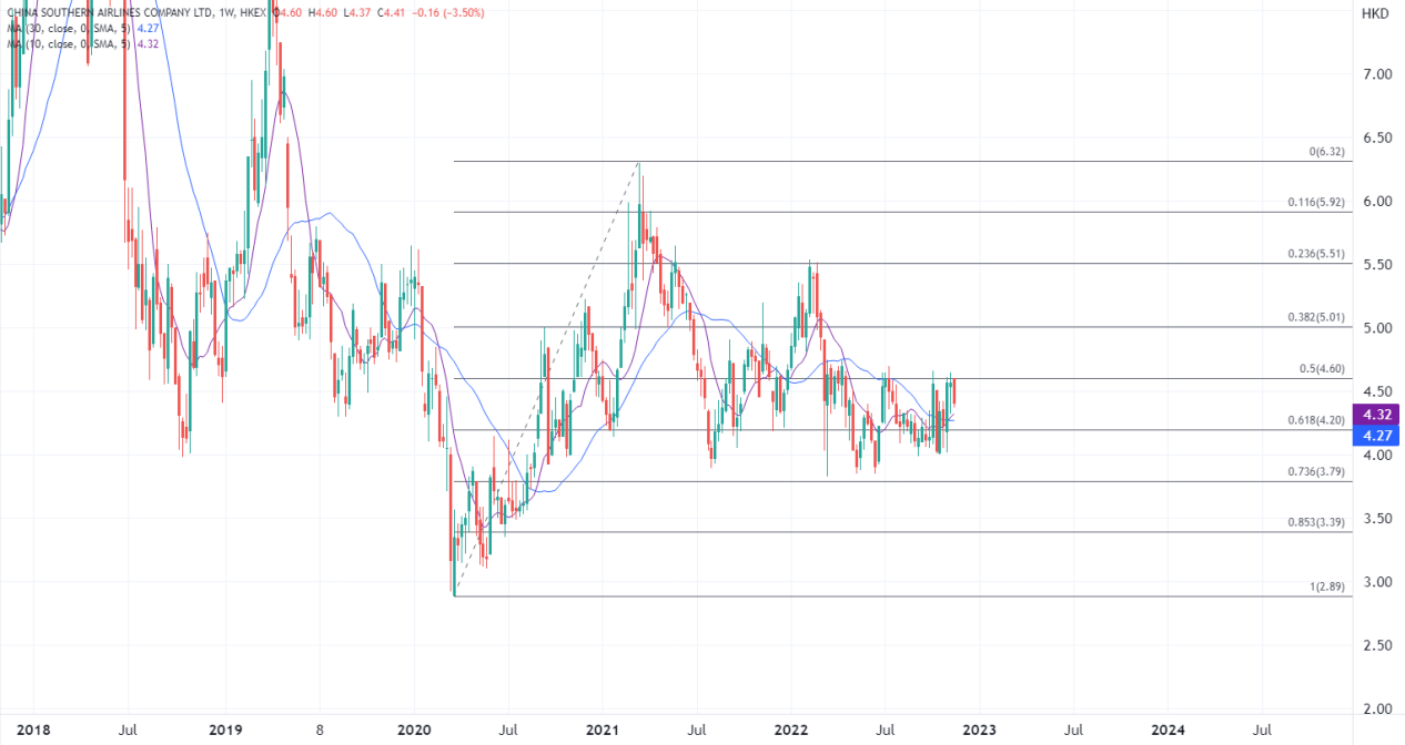 相比之下,跨境出行带来的国际客流是新航季关注的重点,今年第三季度亏损已经环比收窄的南方航空(1055.HK)、中国东航(0670.HK)等,可能在明年春季迎来更加明确的业绩拐点,具备中长期布局的空间。南航股价当前正挑战自4月份以来关键的区间顶部阻力,如果突破将以5港元为主要目标。
