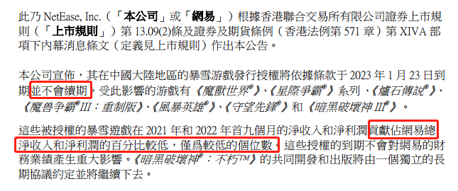 11月17日,网易发布公告称:其与暴雪游戏的合作将于明年1月23日到期,且到期后不再续约,受此影响,《魔兽世界》《守望先锋》《星际争霸》等暴雪的热门游戏将不再有网易代理发行,双方合作开发的《暗黑破坏神:不朽》不在此列,将继续合作。按照网易的说法,暴雪游戏的代理费用所贡献的净利润百分比较低,处于个位数状态,预计不会对往后的业绩数据构成重大影响。网易CEO丁磊讲话称:对于一些涉及到可持续运营、和中国市场及玩家核心利益的关键性合作条款,动视暴雪的要求是不可接受的。至于“关键性条款”具体指什么,丁磊并未详细表述。