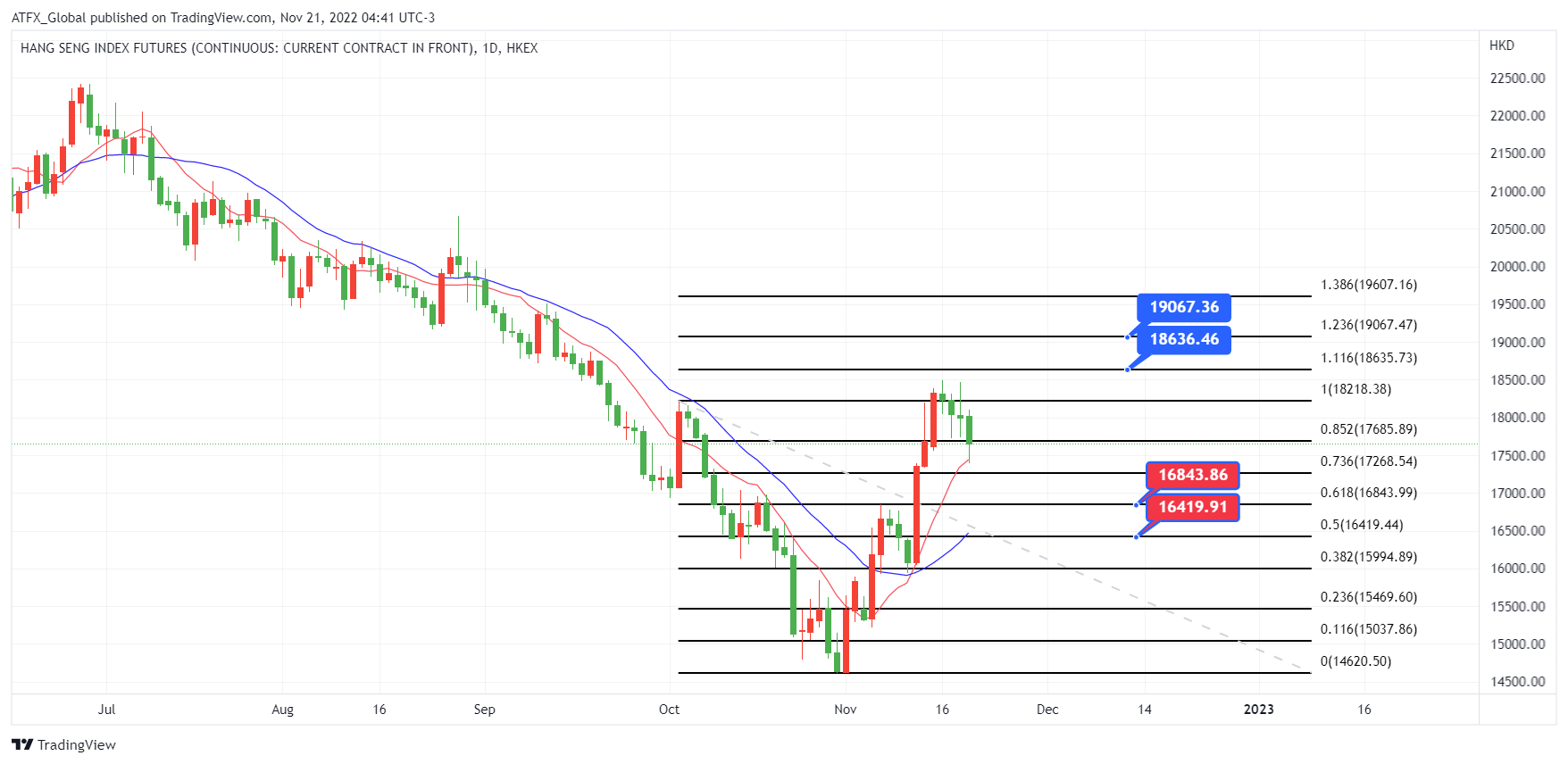 ATFX恒指:随着中国新冠病例数的上升,北京人口最多的地区周一敦促居民呆在家里,而广州至少有一个地区被封锁了五天。由于中国疫情扩大, 投资者担心中国新的防疫限制措施对经济造成影响,导致避险情绪升温不利于股市。 加上上周一系列疲软的中国经济数据,引发了人们对中国经济再度放缓的猜测,周一中港股市同步下跌逾2%。中国蓝筹沪深沪深300指数下跌1.3%,而上证综合指数下跌0.8%。港股失守一万八大关后走势继续偏弱, 连续第四个交易日下跌, 周一午前曾见一周低位报17,390点。
