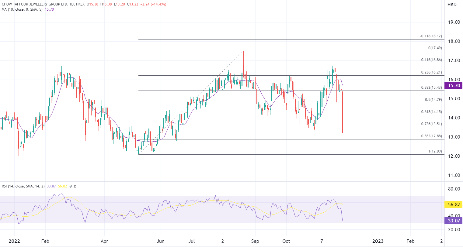 ATFX指出,由于疫情的部分反弹,近期消费股回吐此前由于政策放宽的涨幅,而周大福超过80%收入来自内地,本次业绩中內地同店销售大跌,在疫情政策和形势未明朗前,股价短期内预计继续寻底。而长远看,周大福的品牌优势和市场占有率仍是其具备吸引的关键,当前其也继续聚焦内地下沉市场,零售网络稳步扩张可以支持营业额增长。