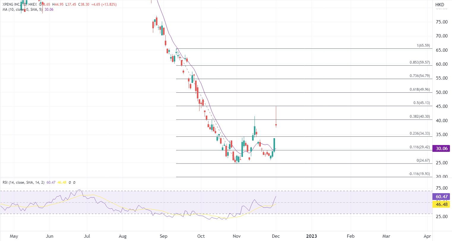 ATFX指出,虽然小鹏交付量和营收连续3个季度同比增速放缓,毛利率在“三大造车新势力”中依然处于垫底,但管理层对于下季度的指引积极,最新财报显示汽车毛利润的提升以及明年Q1新车型的推出,都让市场期待利润端的改善,配合隔夜中概股普遍大涨,小鹏股价跟随走俏。