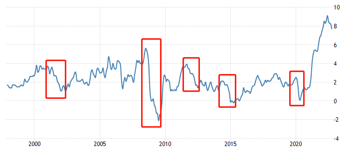 昨日,纽约联储主席威廉姆斯讲话称:明年美国的通胀率将大幅下降,不过要回到2%的央行目标,可能要等到2025年。威廉姆斯认为通胀率的回落是一个漫长且持久的过程,不会出现断崖式的下降。但是,回顾美国过去25年的CPI增速曲线可以发现,通胀率的回落从来都是快速且出人意料的,很少出现温和的下降过程。如下图红框内所示。