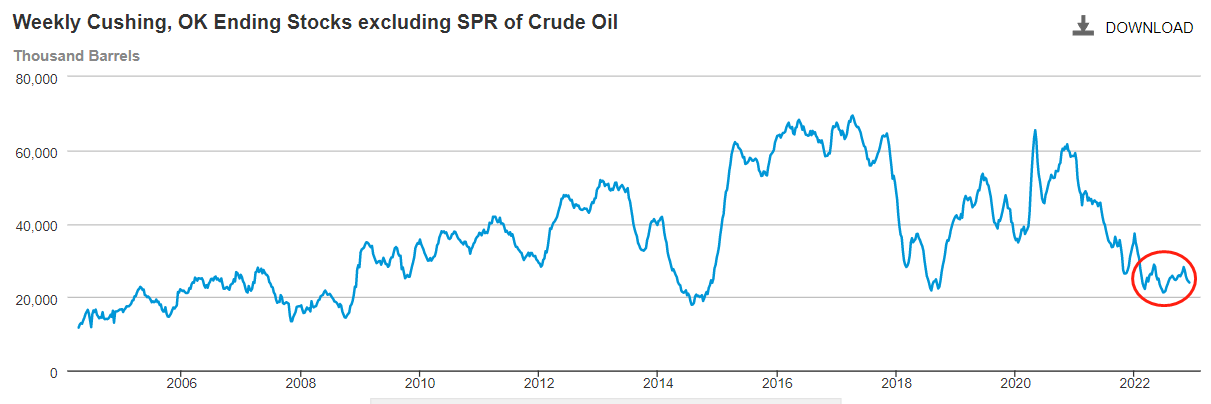 12月4日举行的OPEC+部长级会议上,OPEC+决定坚持其现有政策,即从11月至2023年底,将石油产量每天减少200万桶,约占世界需求的2%。如果国际油价超预期下跌,OPEC+势必开启更大力度的减产规模,这将对油价形成托底作用。经验来看,50美元以下的原油价格将引起产油国恐慌,如果价格继续下行,将不断击穿产油国成本价,最终导致被动减产。相反,WTI在击穿该“成本底”之前,可以一直保持回落态势。