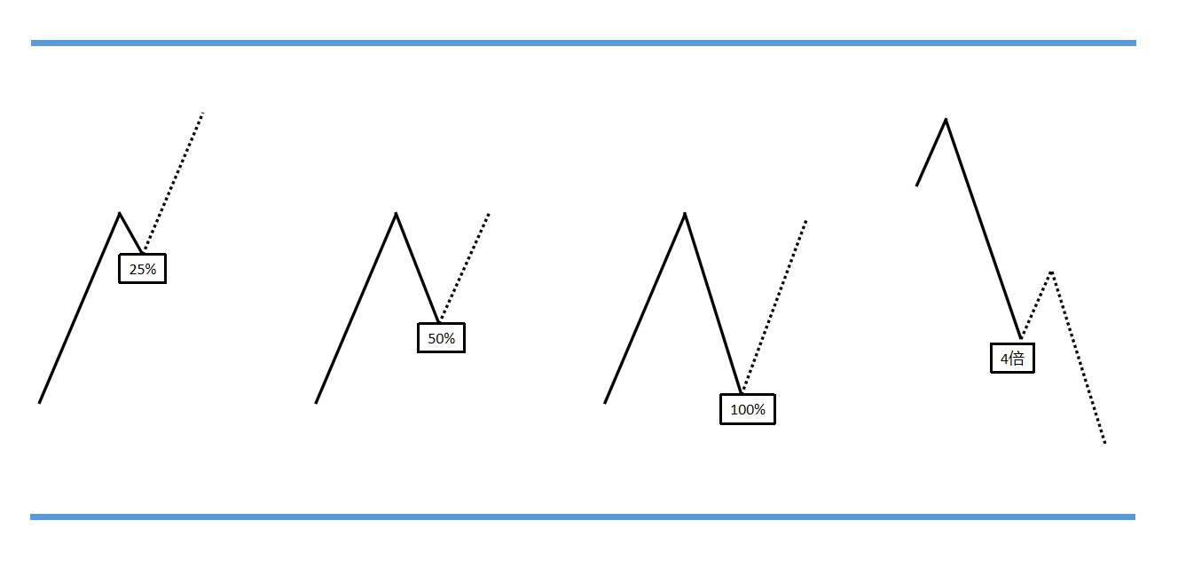 对于第一条来说,25%的比例来自于50%*50%=25%,它相当于把多头趋势划分为四个阶段,如果回调波段连第一个阶段都无法突破,那么代表多头强度非常高,未来产生第二波多头波段的概率更高。第二条和第四条其实是对50%比例的正向使用和反向使用,第二条很明显,不多做解释,对于第四条来说,50%的倒数是2,也就是多空波段两倍关系。第五条实际上和第一条是对应关系,25%的倒数就是4,呼应的是多空波段的四倍关系。第三点是对50%比例的最常见使用,这里不必做过度解析。