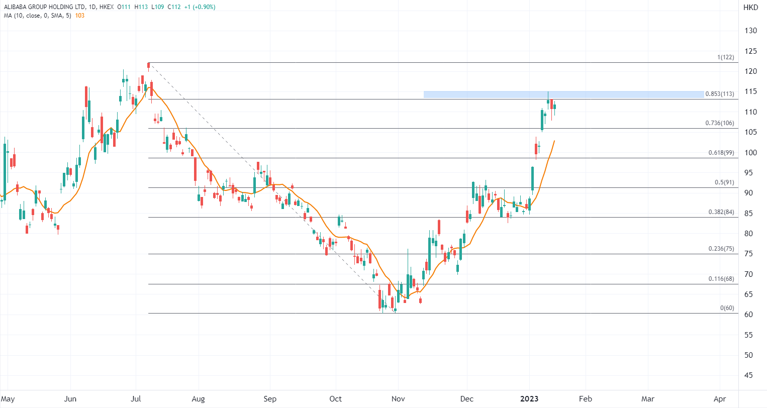 期间阿里股价最高达到去年7月以来高位115港元,自1月初突破盘整区间以来,最高累计上涨35%,当前在113至115港元形成阻力,和大市一样在挑战前高之前先行调整,关注10日均线有望提供支撑,带动其再度反弹,下行方面,若跌破100港元则意味着趋势逆转。