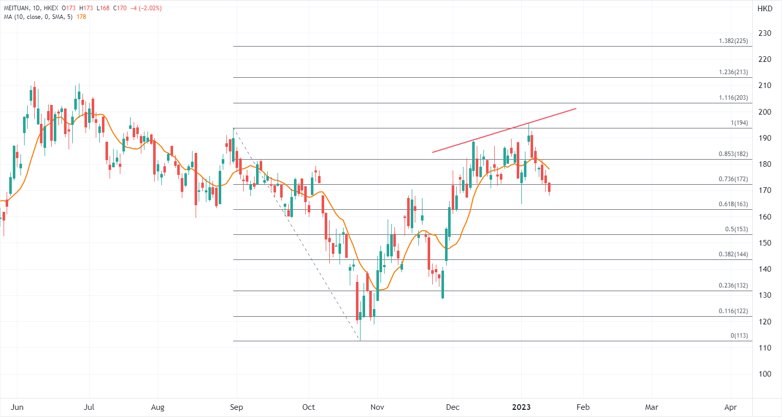 美团股价今年以来短暂上涨,尝试突破前高但反而触发调整,因此形成趋势线阻力,,在下破10日均线后留意有机会继续向153低位靠近,如果配合消息面积极拉动可重新反弹,以200港元心理关口为目标位。