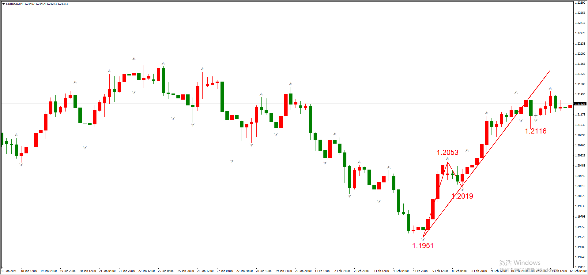 随着时间的推移,新一轮上涨波段出现并持续,直至出现高点1.2143。随后的三根K线,突破前一个回撤勾形所构成的上升速率线,此时选择止盈平仓,止盈价1.2116 。完整的交易为:开仓价1.2053,平仓价1.2116,盈利区间63点。
