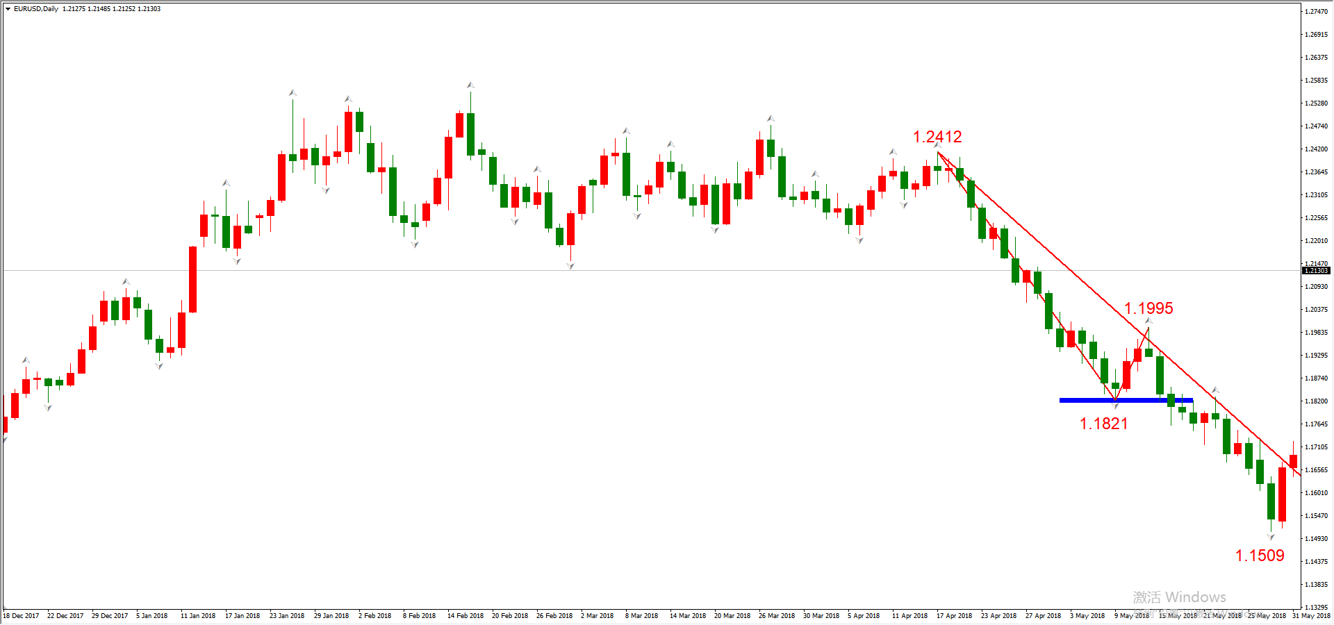 上图中的勾形结构为回撤勾形:1.2412~1.1821~1.1995。左侧下跌波段为1.2412~1.1821,跌幅591点,满足“大幅下跌”要求。右侧波段为1.1821~1.1995,反弹幅度为174点,相比左侧跌幅来说属于“小幅回调”。在突破1.1821低点之后,布局空单,极限止损在1.1995。