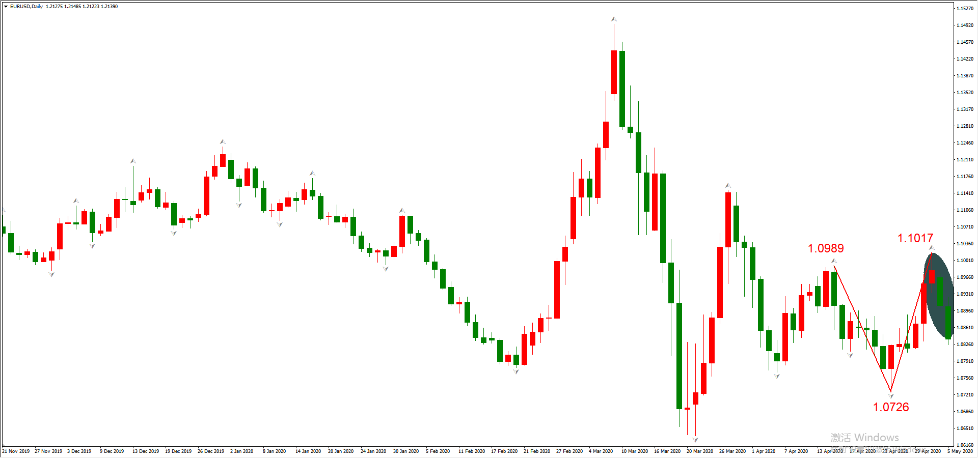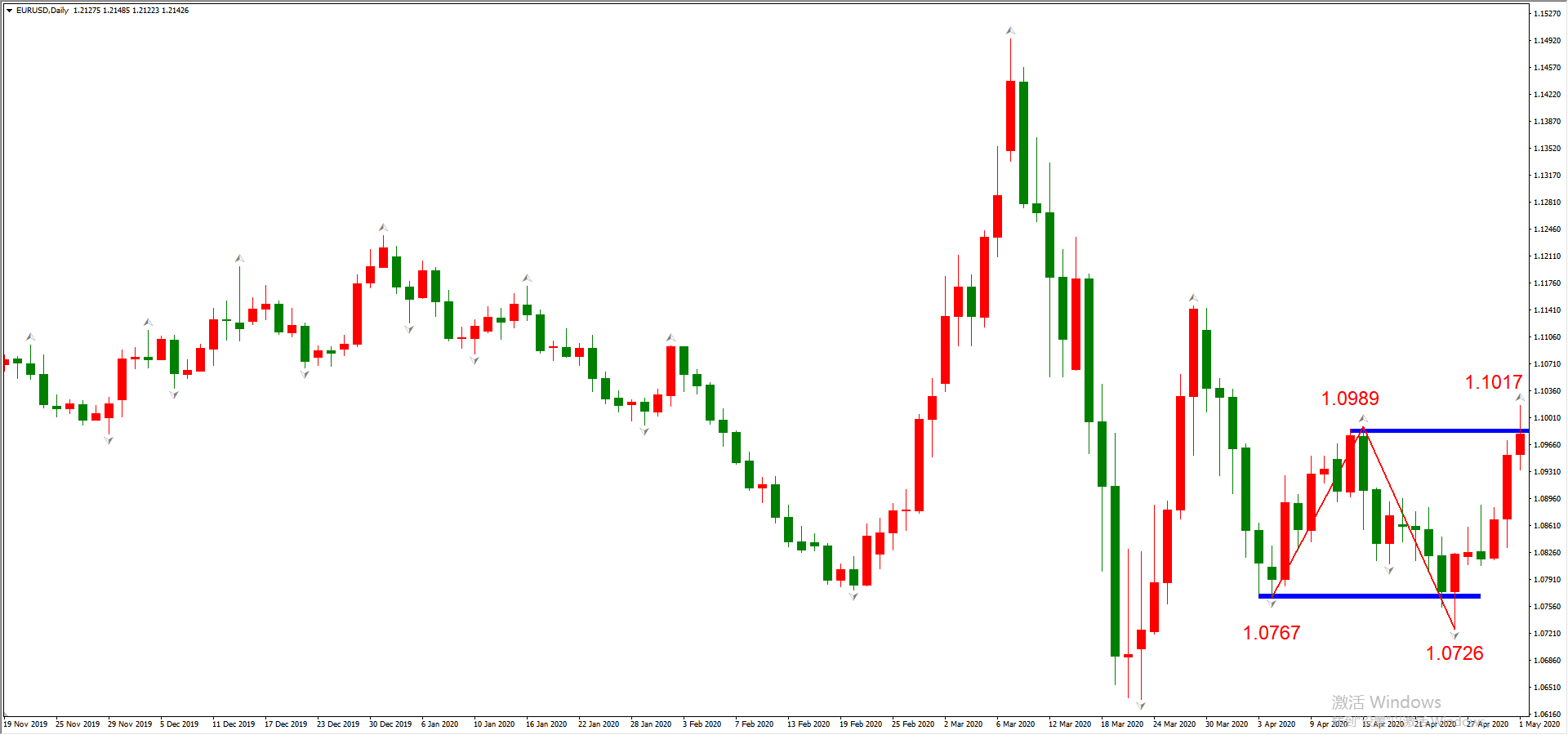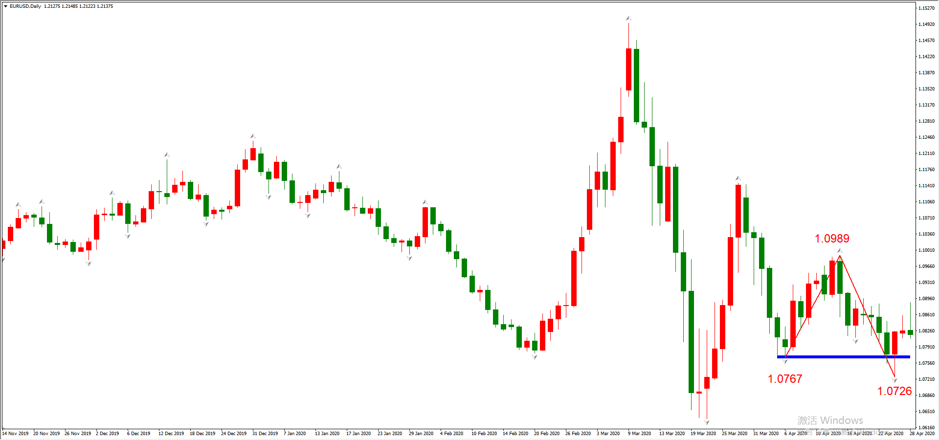 其实,在前一幅图中,以1.0989为起点的三角形结构:1.0989~1.0726~1.1017,就是这里要谈到的“大幅下跌+大幅上涨”模式。左侧下跌波段为1.0989~1.0726幅度为263;右侧上涨波段1.0726~1.1017幅度为291 。左右两侧波段幅度差值为28点,满足“相差不大”的条件。