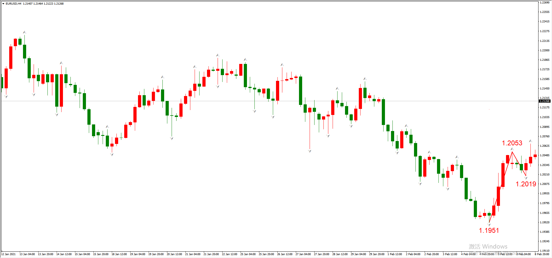 上图中的勾形结构维回撤勾形:1.1951~1.2053~1.2019 。左侧上涨波段为1.1951~1.2053,涨幅102点。由于上图截取的是EURUSD在H4周期的走势图,所以102点算是“大幅上涨”。右侧波段为1.2053~1.2019,回调幅度为34点,满足“小幅回调”的要求。在高点1.2053被突破后,布局多单,极限止损在1.2019 。实际止损以勾形速率线为准。