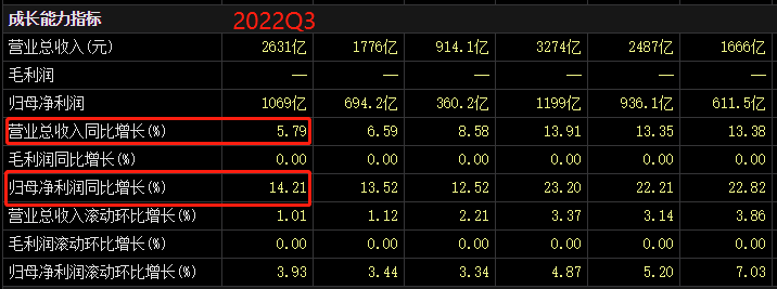 2022年前三季度累计营收2631亿元,同比增长5.79%,低于2022全年营收增速13.91%;净利润总额1069亿元,同比增长14.21%,低于2022全年净利润增速23.2%。可以看出,2022年的业绩增速虽然都是正增长,但全年增速大概率低于2021年。综合来看,招商银行业绩数据增速良好,内在价值相对稳固,股价存有内在的上升动力。