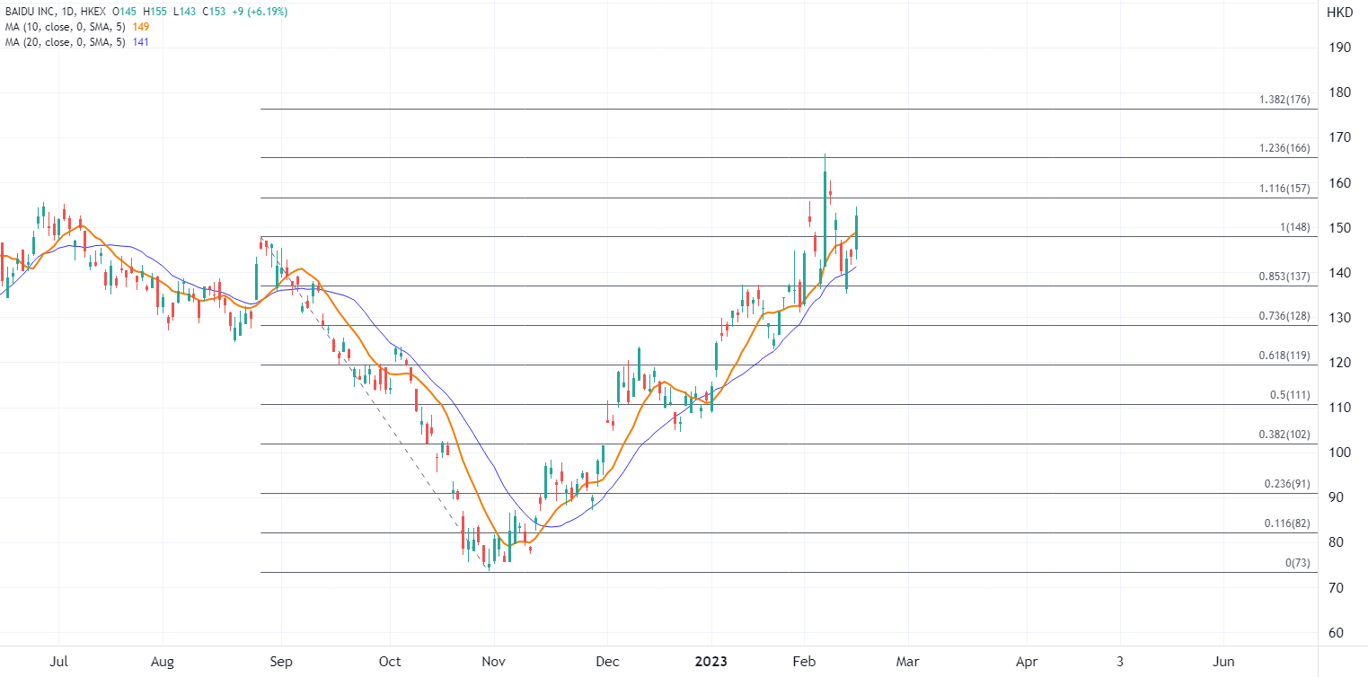 ATFX港股:今日港股下挫跌至一个半月最低,蓝筹股跌多涨少,不过百度(9888.HK)股价逆市上涨,半日收盘涨3.76%报149.1港元,午后涨幅扩大至逾5%。上涨动力依然来自于其旗下类ChatGPT应用文心一言(英文名:ERNIE Bot)。