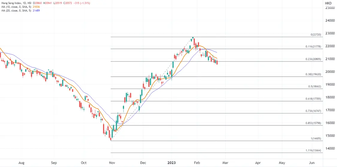 ATFX分析,恒指此前已经连跌三周,本周初尝试反弹但依然缺乏信心跟进,此前利好已经提前随预期兑现,而外围美国加息可能持续更长时间,整体资金流入减少让港股继续处于调整。技术上今早下探日图23.6%斐波位,日内确认收低于该位,则本周可能加速滑向20000点关口,届时关注该关口及19620的初步支撑,因此前的走势表明价格可能会在附近盘整。