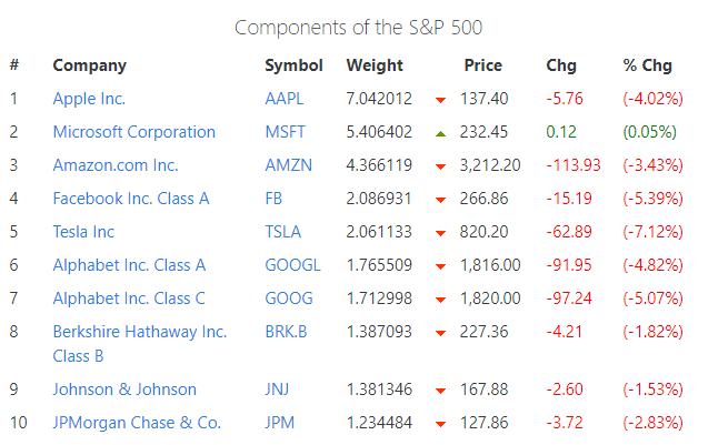 可以看出,Apple(苹果)所占权重高达12.637%,这一比重超过了数十支低权重个股的权重总和。前十支权重股的权重总和,经过简单计算后,为52.403%,占据纳斯达克指数的半壁江山。这是非常畸形的权重分配模式,无法体现大部分个股的涨跌表现。